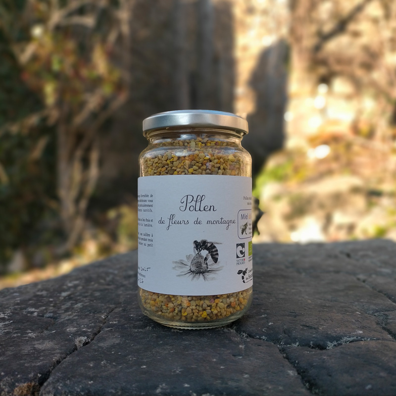 Le pollen frais est proposé tel que les abeilles l’ont récolté les jours précédents dans un espace de flore sauvage de montagne ardéchoise, entre 400 et 1000m d’altitude. Il est présenté en barquettes de 250g correspondant à une cure pour une personne. Il se conserve trois semaines ou peut être congelé. Le pollen frais a la qualité nutritionnelle du pollen séché et des effets supplémentaires dus à la présence des bactéries lactiques qui rendent le produit auto conservable (à température ambiante) sans soins particuliers, qui permettent une meilleure assimilation des nutriments fins du pollen et qui contribuent, pendant et après la cure, à optimiser les processus d’assimilation et d’élimination des déchets de l’organisme. Le produit se conserve dans son emballage ou sur une assiette, à l’abri de la poussière, sans couvercle hermétique : il doit respirer. La cure dure trois semaines à raison d’une cuiller à soupe rase par jour. Il est conseillé de laisser à l’organisme un temps de réaction (de même durée / 3 semaines) après une nouvelle cure. Les prises ont lieu dans la première moitié de la journée, pollen pur ou associé à un aliment solide ou liquide (à la différence du pollen sec qui doit obligatoirement être mastiqué). La cure peut être différée en congelant le produit dans un contenant adapté; après décongélation le pollen doit être conservé en récipient ouvert au réfrigérateur.