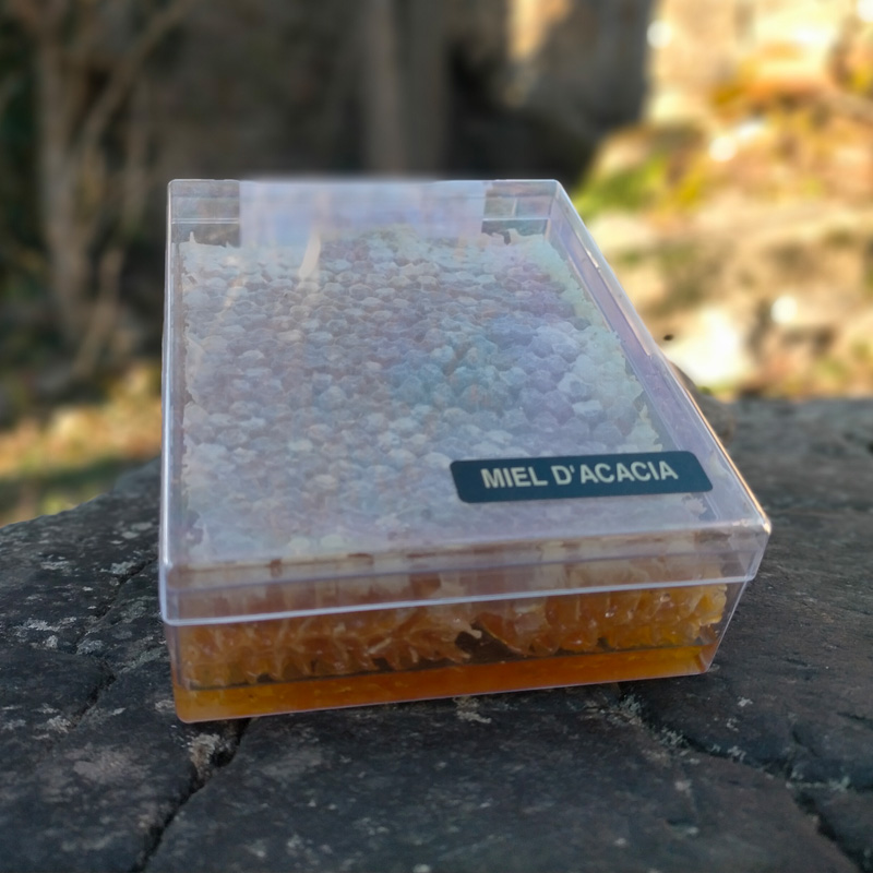 Ce miel de qualité est récolté et mis en pot par Vincent Canova. La récolte du miel se fait entre le 15 juillet et le 15 août. Grand soin est apporté aux récoltes, qui se font de plus en plus rares. Un climat étrange règne alors dans la miellerie qui livre des fluides ambre, or, fauve ou ébène. Tous ont en commun le reflet d’un terroir : ici l’aubépine qui domine, là le miellat de chêne aux parfums balsamiques qui équilibrent la vivacité des arômes de fleurs sauvages, là encore les sorbiers qui évoquent les lisières des hautes prairies. A l’altitude de 600m, le châtaignier qui répand au mois de juin ses effluves suaves donne aux miels sont amertume typique. Une partie des miels récoltés est réservée au nourrissage des abeilles et retourne dans les ruches, les miels de caractère sont proposés à la vente.
