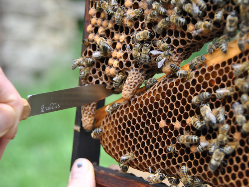 - Nourrissage au miel pour les essaims comme pour les colonies avant l’hiver